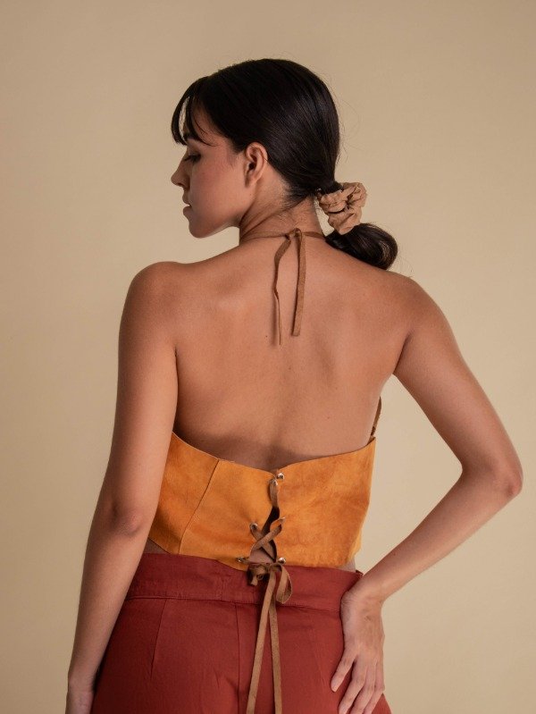 En este caso, se ata en la espalda y en el cuello por lo que se adapta al cuero. Esta hecho a base de retazos, por lo que primero creamos la tela y luego cortamos la prenda
