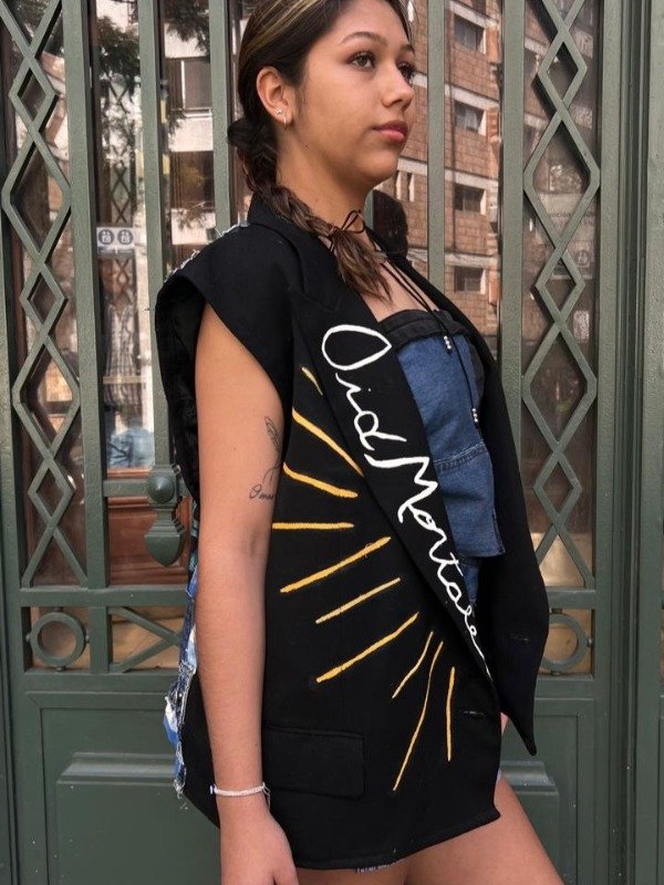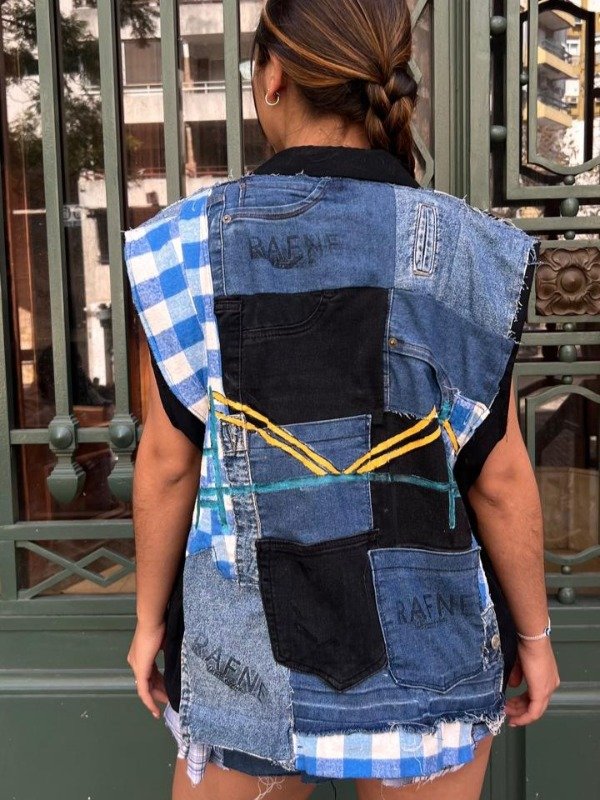 La prenda nace de la transformación de un saco sastrero cruzado de hombre, reinterpretado bajo el concepto de upcycling. En su espalda se despliega un patchwork artesanal realizado a partir de diferentes prendas recuperadas: botones, cuello de camisa, bolsillos y fragmentos de una falda de jean, entre otros.
