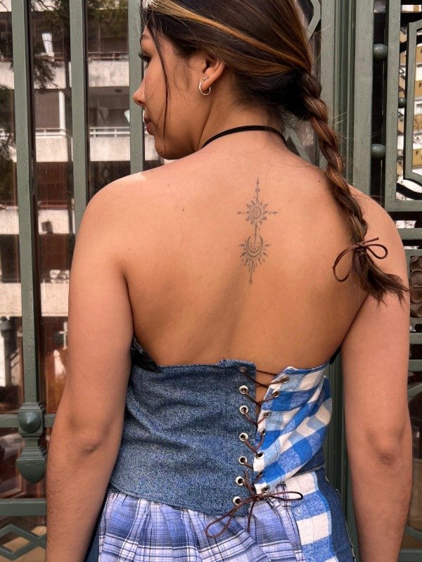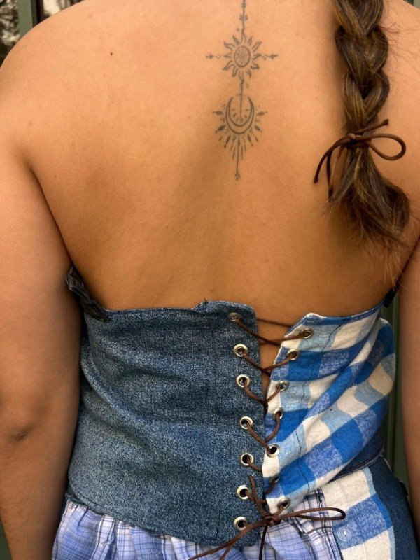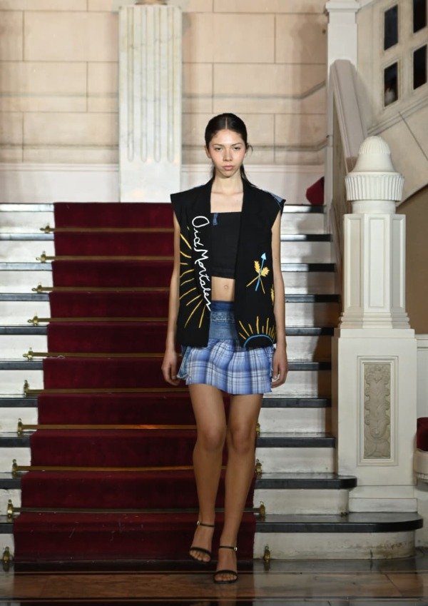 Pieza única diseñada y confeccionada especialmente para el desfile del concurso emergente en Argentina Fashion Week. El top está confeccionado a partir de denim y camisas en técnica de upcycling, con un diseño que combina lo artesanal y lo contemporáneo.