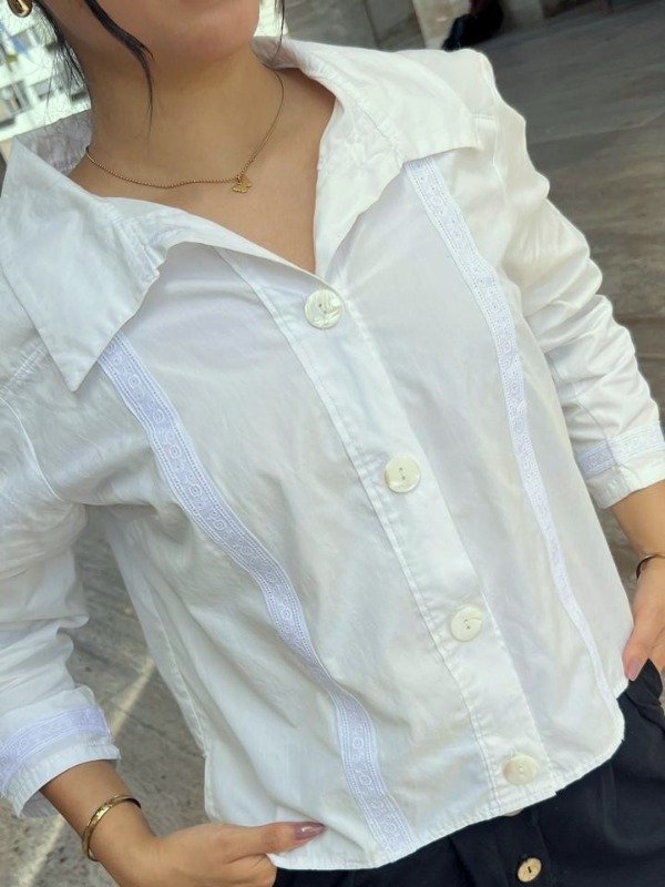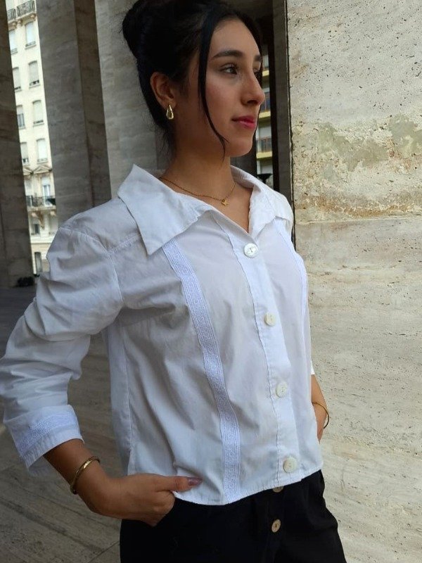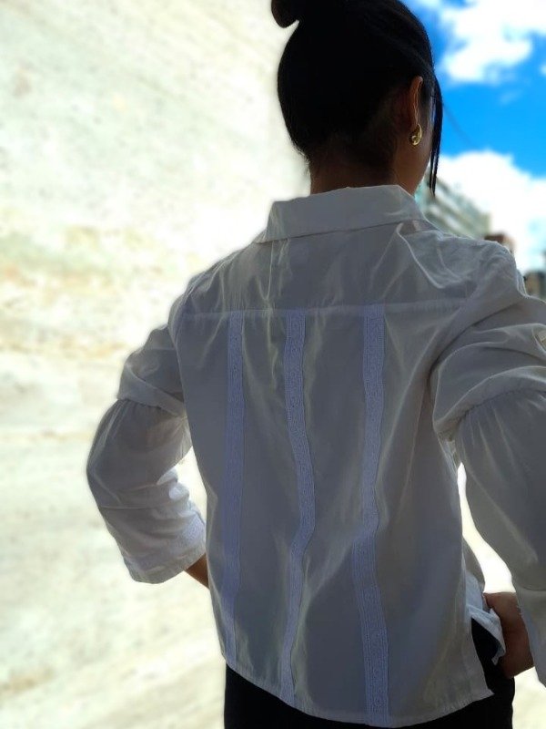 Corte holgado con amplitud, y mangas largas amplia con recorte. Cuenta con detalles de encajes de algodón, nuestro característico cuello solapa y canesú en espalda.
